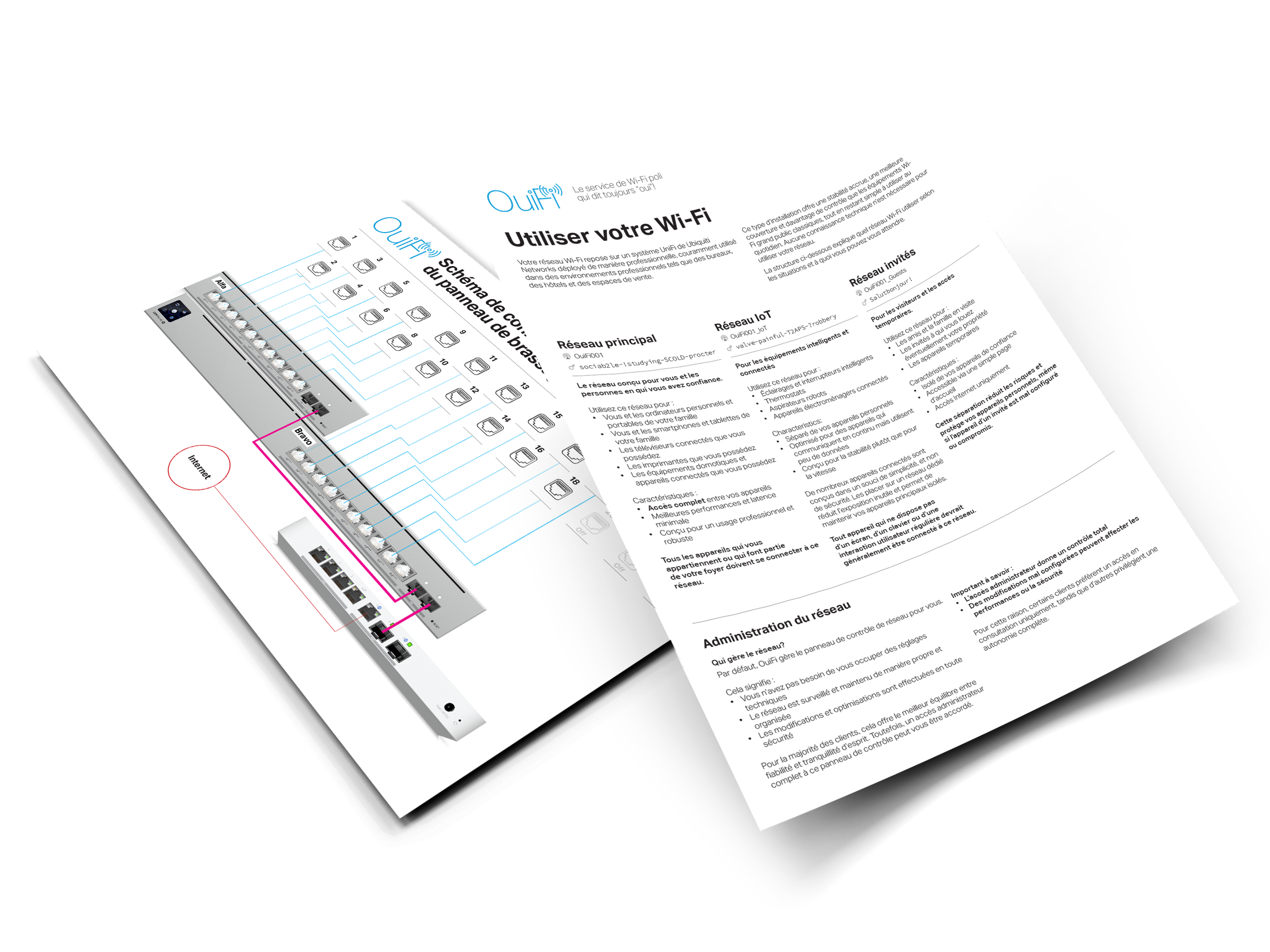 À l’issue de l’installation, vous recevez un schéma clair de votre réseau ainsi qu’un guide d’utilisation simple expliquant les différents réseaux Wi-Fi configurés et leur usage.